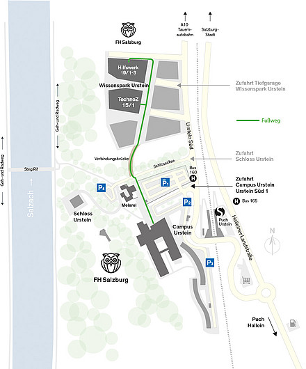 Bitte benützen Sie für die Anreise die öffentlichen Verkehrsmittel. Die Haltestelle Puch Urstein (Bahnverbindung S 3) befindet sich direkt am Campus. Die Buslinien 160 und 165 halten ebenfalls am Campus Urstein.