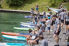 The 2nd edition of the FH Teamathlon took place in the Waldbad Anif on 7 June 2024 in perfect weather and ideal conditions. Around 100 participants took part in 27 teams in the teamathlon in the disciplines of stand-up paddling, cycling, boccia and running.