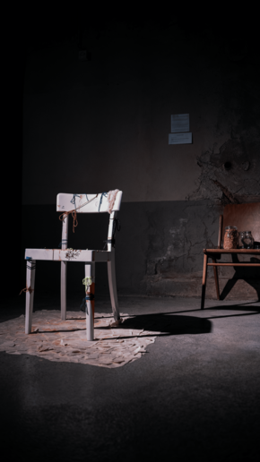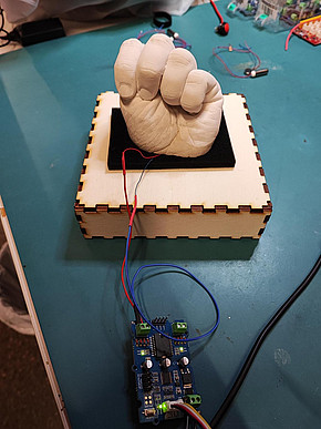 Durch vibrierende Gipsfäuste lädt die Arbeit Besucher:innen ein, die Emotionen zu spüren, die eine Faust hervorrufen kann.