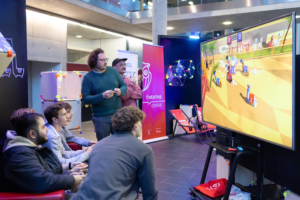 Das Event begann mit dem Pixel Playground im Foyer der FH Salzburg. Diese interaktive Ausstellung bot den Teilnehmer*innen die Möglichkeit, die Spiele der FH Salzburg Studierenden und Absolvent*innen zu testen sowie Entwicklungen im Bereich der digitalen Medien und Spieleentwicklung hautnah zu erleben.