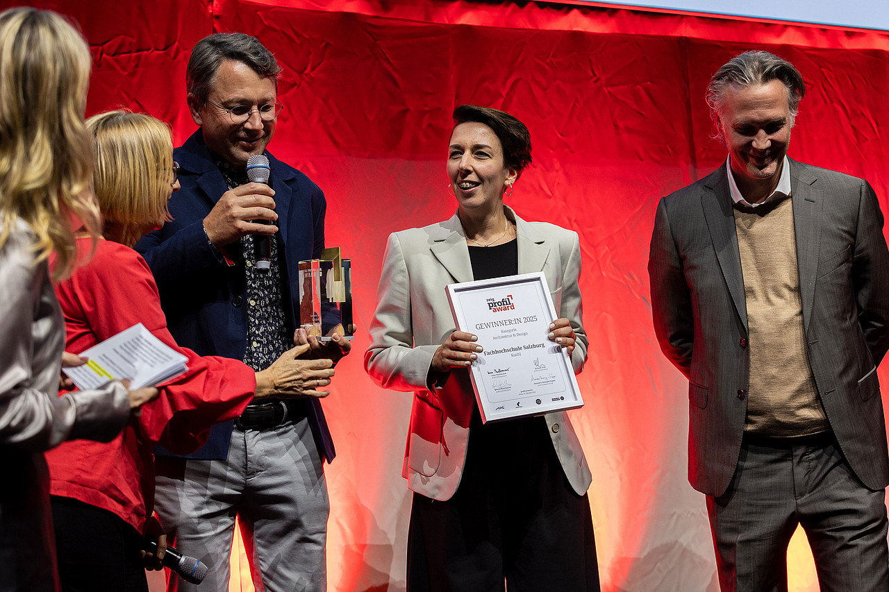 Die Fachhochschule Salzburg wurde mit dem profil Award 2025 in der Kategorie Architektur & Design ausgezeichnet – für die Ausstellung „CIRCULAR MATERIALS – Rohstoff oder Reststoff?“. Die Preisverleihung fand im Atelierhaus der bildenden Künste in Wien vor rund 300 geladenen Gästen aus Wirtschaft, Politik und Kultur statt. Aus 250 eingereichten Projekten wurden sechs Preisträger*innen für ihre mutigen Zukunftsvisionen, gesellschaftliche Verantwortung und Innovationskraft geehrt.