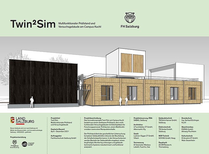 Am Campus Kuchl der FH Salzburg entsteht derzeit das Forschungsgebäude „Twin²Sim“. Dieses besteht aus einem Prüfstand, einem multifunktionalen Versuchsgebäude mit 20 hochwertigen Arbeitsplätzen für das Forschungspersonal, Prüfräumen, einem Multifunktionslabor sowie einer Manipulationshalle.