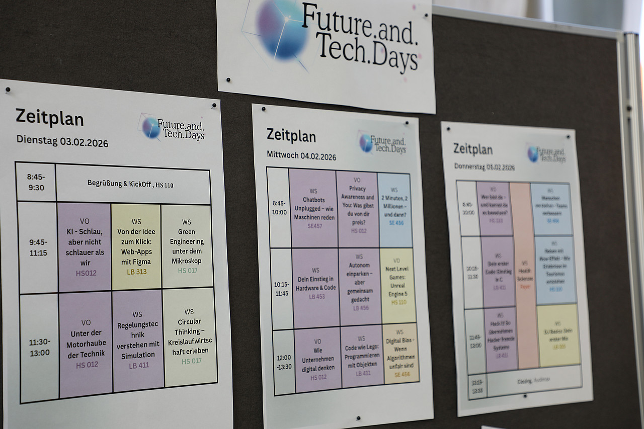 Ein besonderes Merkmal der Future.and.Tech-Days ist die individuelle Programmgestaltung: Über ein Online-Tool stellten sich die Teilnehmer*innen ihre persönlichen Vorlesungstage selbst zusammen. So erlebten sie nicht nur spannende Inhalte, sondern auch einen authentischen Eindruck vom Studienalltag, der Eigenverantwortung und Entscheidungsfreiheit an einer Fachhochschule.