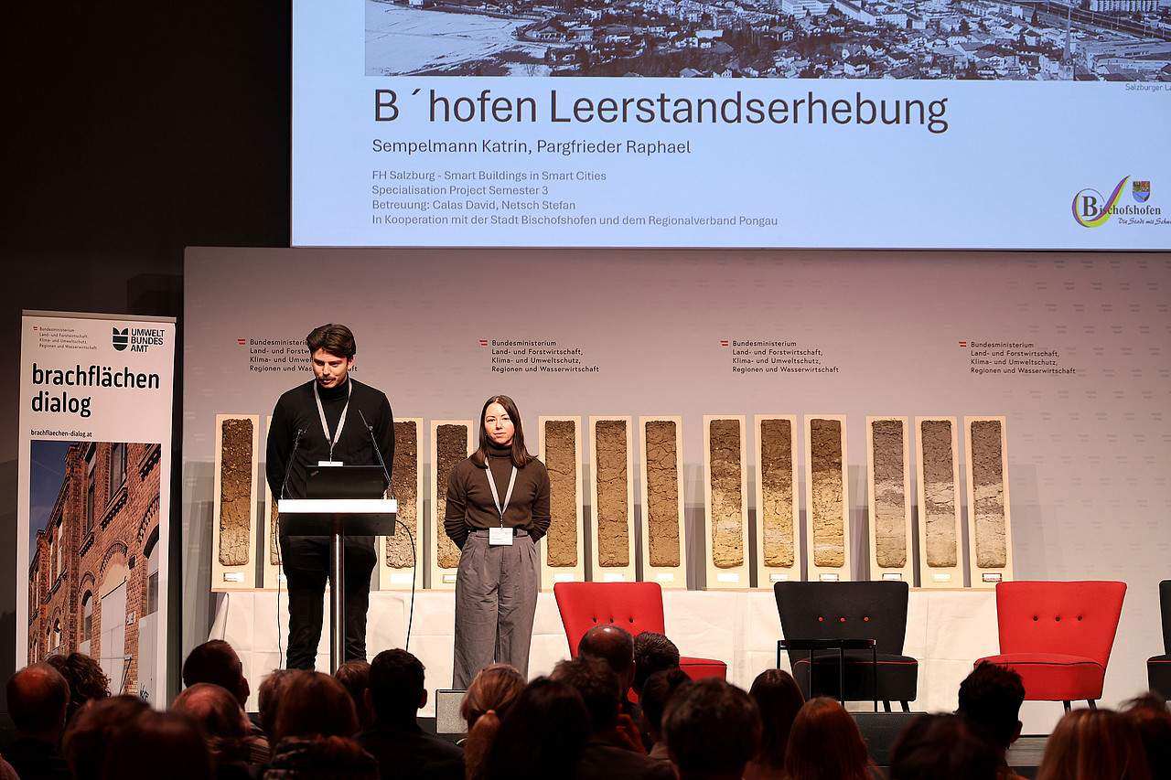 Ende Jänner fand der 4. Brachflächengipfel in Wien statt, organisiert vom Bundesministerium für Land- und Forstwirtschaft, Klima- und Umweltschutz, Regionen und Wasserwirtschaft (BMLUK). Der Gipfel gilt als zentrale Plattform für Bodenschutz, Flächenrecycling und den fachlichen Austausch zur nachhaltigen Wiedernutzung ungenutzter Flächen in Österreich. Mitten darin: die beiden Masterstudierenden Katrin Sempelmann und Raphael Pargfrieder aus dem Studiengang Smart Buildings in Smart Cities, die eingeladen wurden, ihre Projektarbeit „Leerstandserhebung und Leerstandsaktivierung Bischhofshofen“ einem ausgewählten Fachpublikum zu präsentieren.