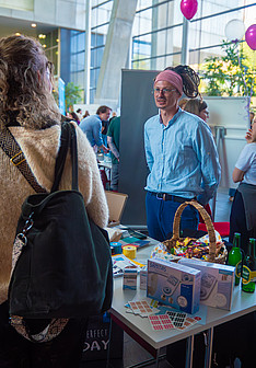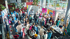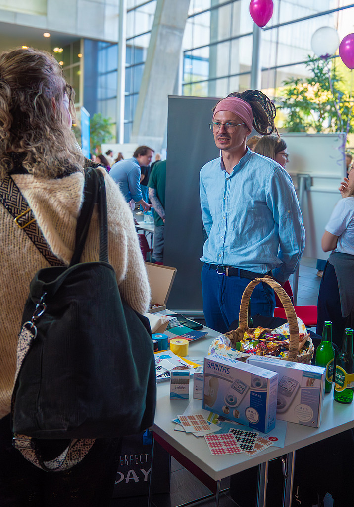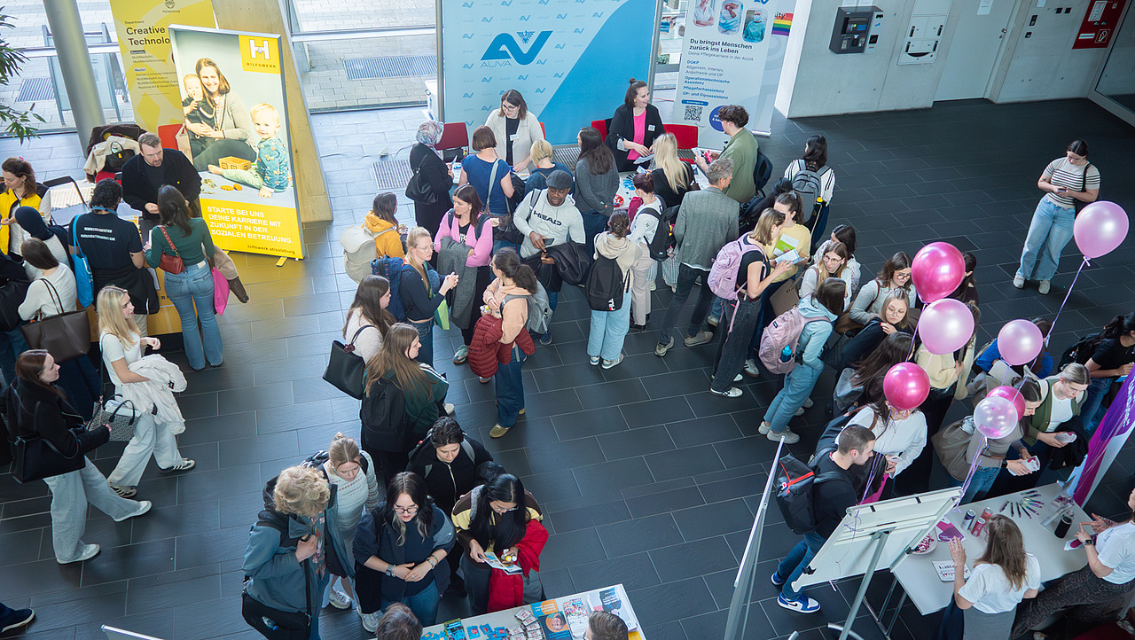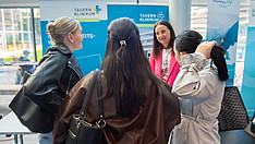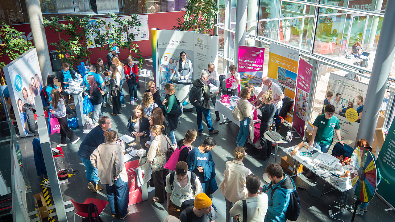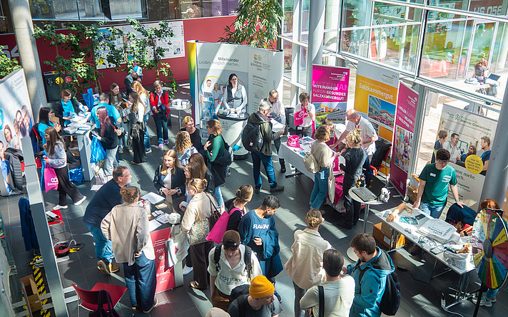 Nach der Keynote hatten die Studierenden Gelegenheit, mit rund 25 Aussteller*innen aus dem Gesundheitsbereich persönlich ins Gespräch zu kommen. An den Messeständen konnten sie unterschiedliche Berufsfelder kennenlernen, sich über Praktika, Jobmöglichkeiten und Einstiegsprogramme informieren und in entspannter Atmosphäre individuelle Fragen klären.