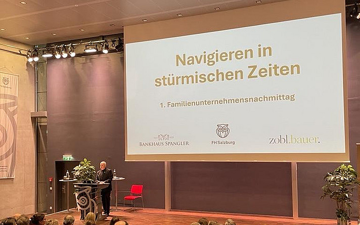 Rund 200 Teilnehmerinnen und Teilnehmer folgten am 19. März 2026 der Einladung zum Familienunternehmensnachmittag an der Fachhochschule Salzburg. Unter dem Leitthema „Navigieren in stürmischen Zeiten“ bot die gemeinsame Veranstaltung von Bankhaus Spängler, zobl.bauer. und der FH Salzburg eine hochwertige Plattform für Austausch, Orientierung und neue Impulse für Familienunternehmen.