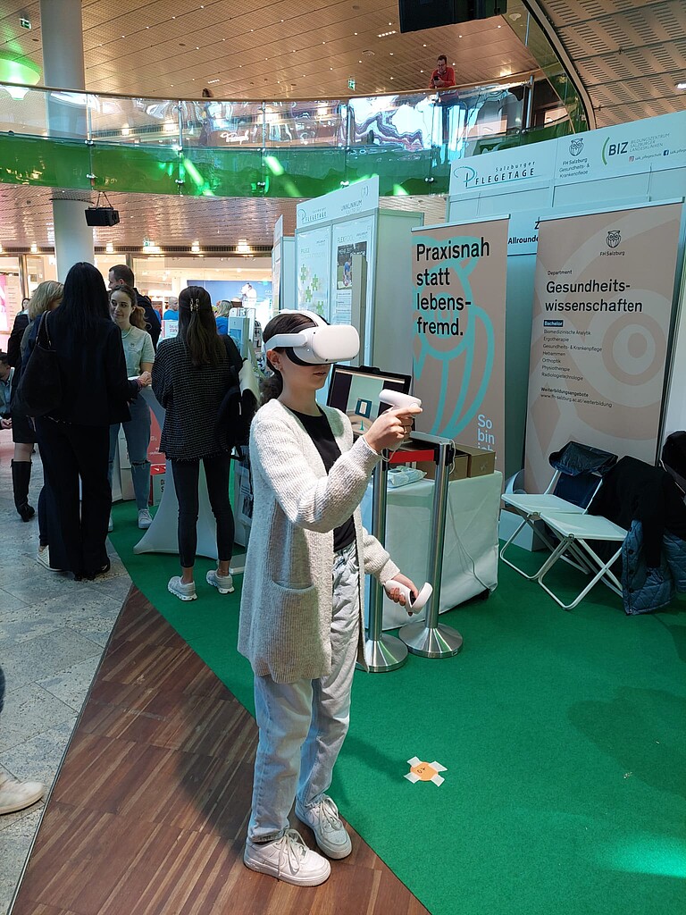 Am Stand der Gesundheits- & Krankenpflege konnten Besucher nicht nur mehr über das Studium und die dazugehörigen Berufsbilder erfahren, sondern auch mittels VR Simulation realistische Pflegeszenarien erleben. Die interaktive Erfahrung ermöglichte es den Teilnehmer*innen, Pflegesituationen kennenzulernen und angemessen darauf zu reagieren, so wie es dann auch im Klinikalltag von ihnen gefordert wird.