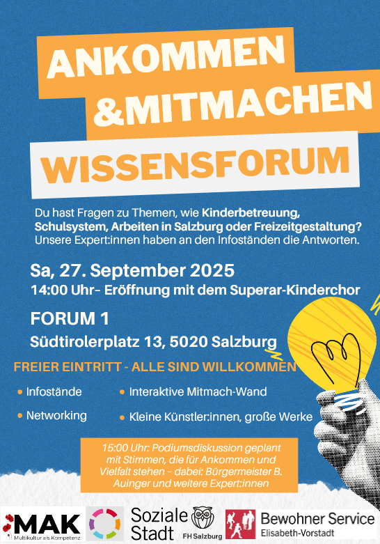„Das Wissensforum Salzburg versteht Diversität als zentrale gesellschaftliche Ressource. Unser Anliegen ist es, Räume zu schaffen, in denen Wissen, Erfahrung und Perspektiven unterschiedlicher Gruppen in Dialog treten können. Durch interdisziplinäre Formate und partizipative Ansätze fördern wir die Vernetzung zwischen Generationen, Professionen und Kulturen und leisten damit einen Beitrag zu einer gelebten Willkommenskultur in Salzburg.“