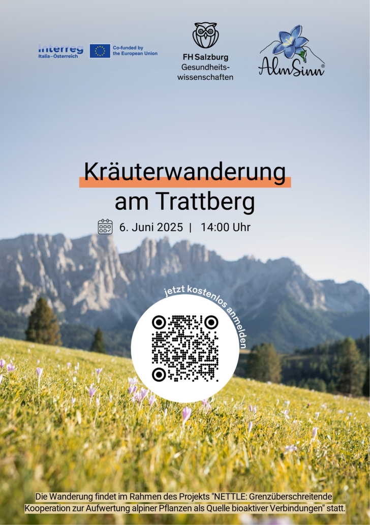 Im Rahmen des Interreg Projekts “NETTLE: Grenzüberschreitende Kooperation zur Aufwertung alpiner Pflanzen als Quelle bioaktiver Verbindungen” sollen die untersuchten Pflanzen und deren potentielle medizinische Wirkungen auch der Bevölkerung nähergebracht werden. Bei einer kostenlosen Kräuterwanderung rund um die Enzianhütte am Trattberg in Kooperation mit der Kräuterpädagogin Martina Egger “AlmSinn” wird diese den Teilnehmer*innen vieles über die verschiedenen Kräuter der Region erzählen. Forscherinnen des Studiengangs Biomedizinische Analytik der FH Salzburg werden bei der Wanderung außerdem näher auf das phytochemische Profil, die antioxidative, antimikrobielle und entzündungshemmende Wirkung von bioaktiven Extrakten aus bestimmten Pflanzenarten eingehen, welche im Interreg Projekt NETTLE erforscht werden.