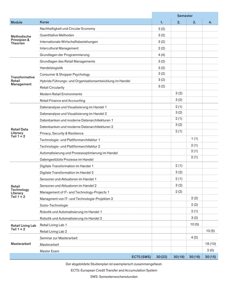 Darauf aufbauend erfolgt in den Semestern zwei und drei die Vermittlung technologischer Kompetenzen. Der Fokus liegt dabei auf der Verarbeitung und Analyse handelsrelevanter Daten (Retail Data Literacy) sowie dem Verständnis, der Anwendung und Weiterentwicklung technologischer Systeme im Handel (Retail Technology Literacy).