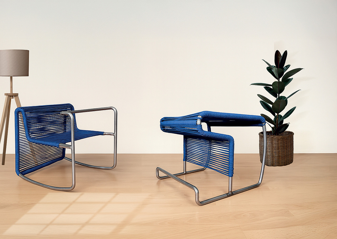 Der Name BOUCLE verweist auf die dynamische Linienführung des Stahlrahmens. Die Sitz- und Rückenflächen sind mit Schnüren bespannt, was dem Hocker Leichtigkeit verleiht. BOUCLE dient als schaukelnder Kinderstuhl, und um 90 Grad gedreht, verwandelt er sich in einen funktionalen Hocker für Erwachsene. Ein Möbel, das Spaß, Wandelbarkeit und Minimalismus vereint.